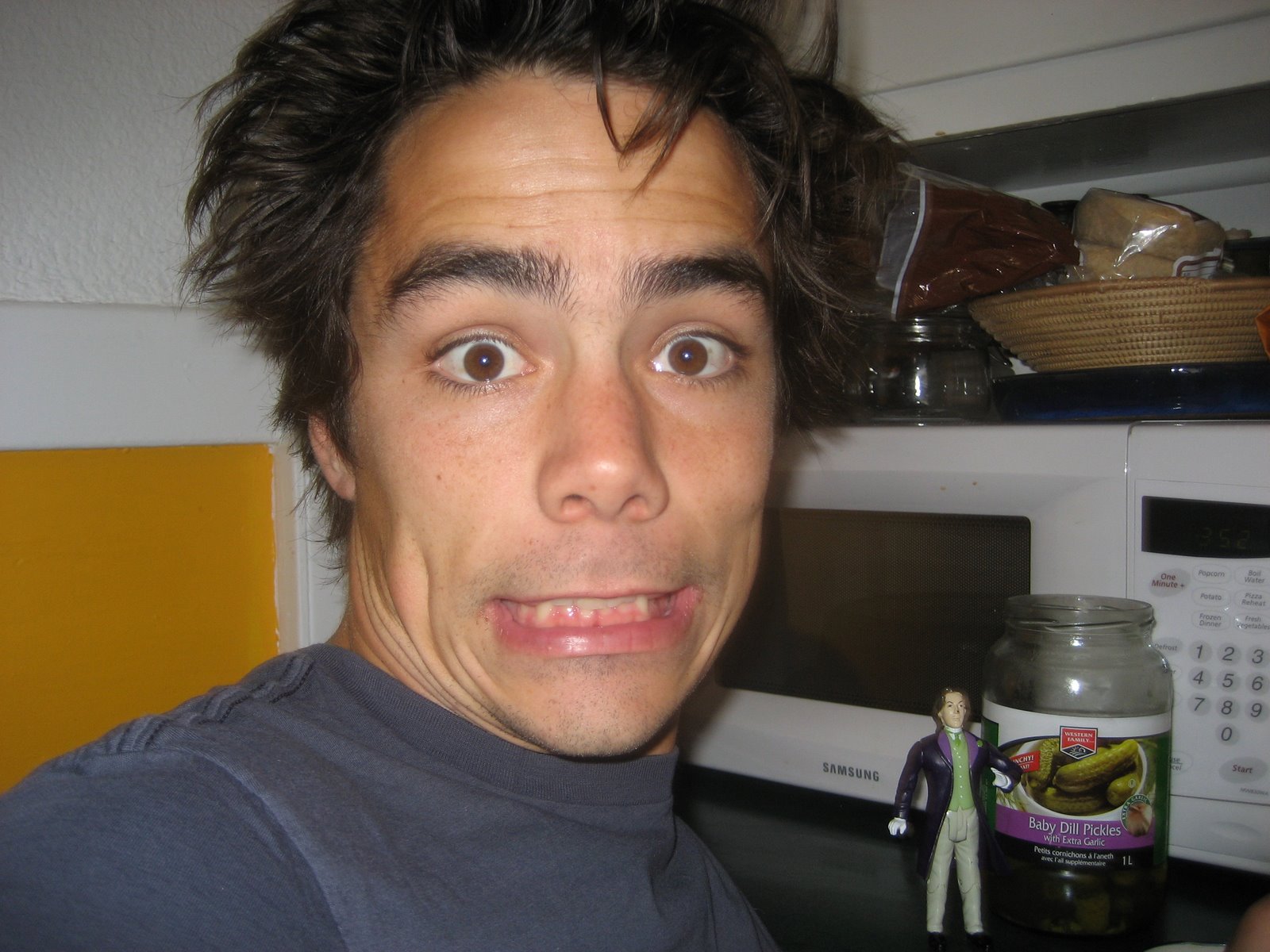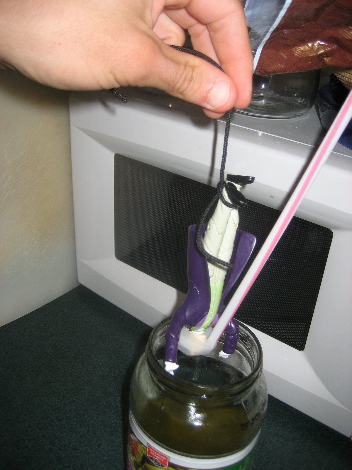 Known more for his play writing, Oscar is attempting to not only suspend himself upside down, but do so locked from within a jar of pickles.